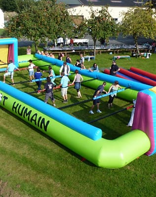 Le baby-foot humain est une version grandeur nature du jeu de table classique. À l'instar de sa version miniaturisée, il reproduit les principes du football, mais avec une touche unique : ce sont de vraies personnes qui prennent la place des petites figurines. Les participants sont attachés à des barres horizontales placées dans une structure gonflable, les empêchant de se déplacer librement, mais leur permettant de se déplacer latéralement, exactement comme les figurines. Cette activité est généralement jouée en extérieur, souvent lors d'événements communautaires, de festivals ou d'activités de team building.